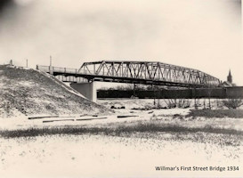 | F is for First Street Bridge. The bids for the First Street bridge in City of Willmar, Minnesota were called for in May 1934. In the newspaper article from May 6, 1934, it states that the bridge will cross the Great Northern tracks as an extension of North First Street. It will have three truss spans and will be 980 feet in length. The work began on the bridge in June 1934. One major hiccup to the project happened in October 1934 when the north span of the bridge dropped from its moorings and crashed on top of the freight cars standing on the tracks below. Only one man was injured as it happened in the evening. The north span weighed between 175-200 tons. and damaged six freight cars. The bridge opened in December 1934 with a parade and dedication ceremony. This bridge was a way to formally open a gateway to Kandiyohi County parks and lakes. This bridge was replaced with the current bridge in the early 1990s. At the dedication there was a banner on the south side of the bridge declaring: "Gateway to Minnesota Lakes!" |