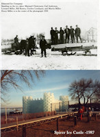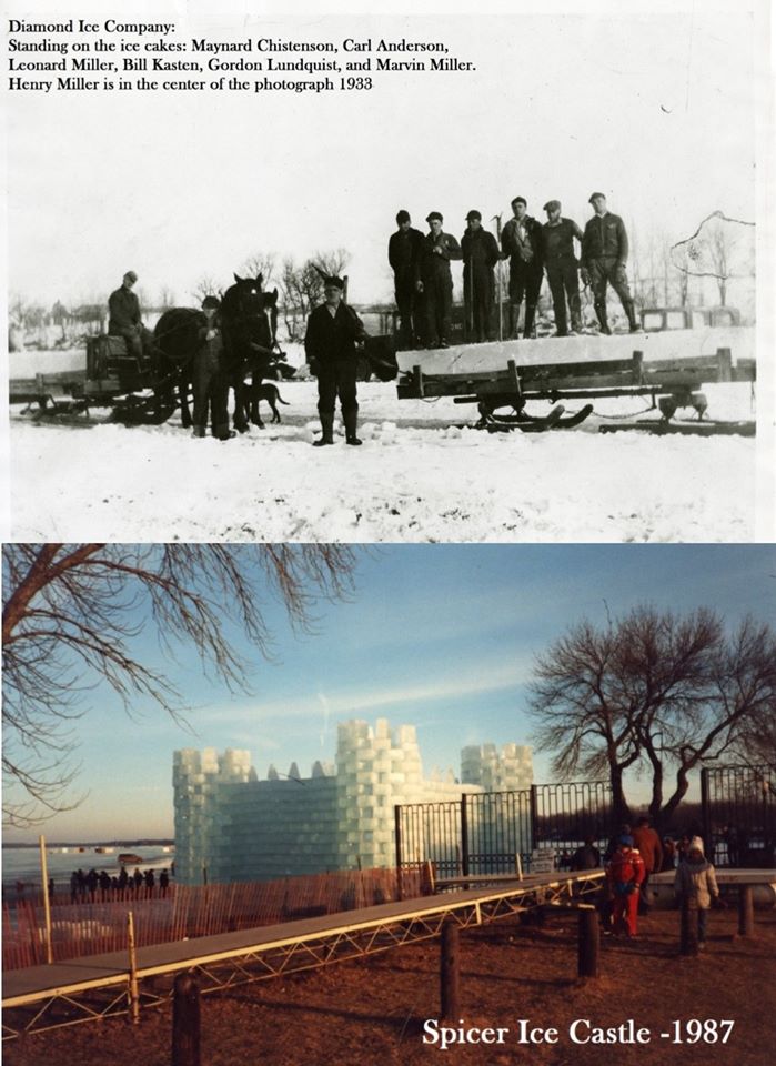 | I is for Ice. Ice has been an important part of Kandiyohi County's history. Before refrigerators, the residents and businesses of the county would harvest ice out of the many lakes to use for refrigerating their goods. They would cut blocks of ice out of the lake and haul it to ice houses for storage. The Railroad yards had ice houses to store the ice for the refrigerated cars. Ice harvesting started to decline in the 1940s-1950s when the mechanically operated refrigerators became popular for use. The City of Spicer still uses ice harvesting today. During their Winterfest celebration in the winter, ice is harvested out of Green Lake to build an ice castle. |