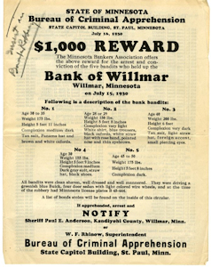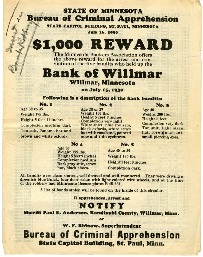 W is for Willmar. The railroad came through Willmar in 1869 and the railroad platted out the town of Willmar in 1870. The town is named after Leon Willmar, a businessman from Belgium who worked for the railroad at this time. It became the county seat of Kandiyohi County in 1871 after a contentious battle with Kandiyohi Station. It has been a long time railroad hub since the beginning. The town was incorporated in 1874. One of the more well-known happenings in Willmar is the Bank Robbery that happened on July 15, 1930. Five armed gunmen robbed the Bank of Willmar, located at the intersection of 5th St. and Litchfield Ave, and go away with $70,000 bonds, cash and gold. The five gunman were Harvey Bailey, Tommy Holden, Robert Steinhardt “Frisco Dutch”, Joseph Cretzer “Dutch Joe”, Sammie Silverman “Jew Sammie” and George “Machine Gun” Kelly. After the alarm rang out, gun fire ensued. Two robbers and three bystanders were shot that day, Robert Steinhardt died from his wound. These men were never caught and never tried for the bank robbery. At the time of the robbery, George Kelly did not have his nickname of “Machine Gun” yet, it came two years after the Willmar robbery when his wife gave him a tommy gun as a gift. Check out the article below for more information on the robbery.